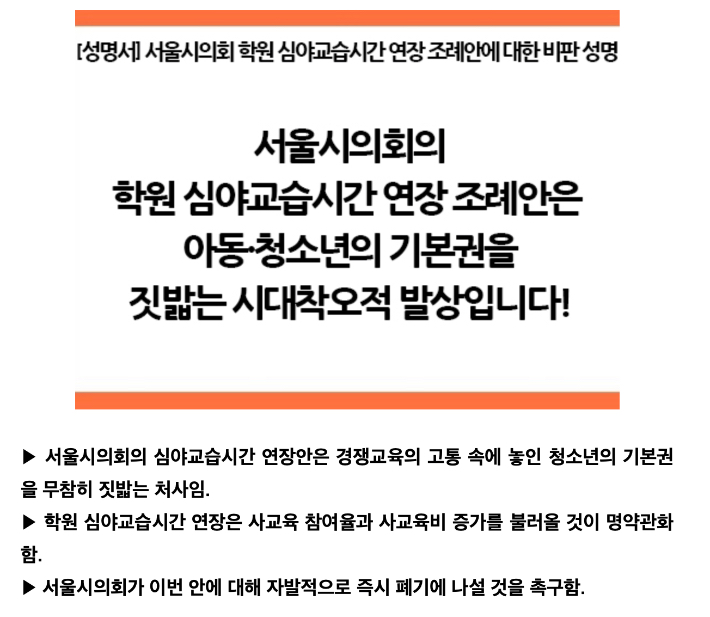 좋은교사운동, "학원 심야교습시간 연장 조례안 즉각 폐기해야"