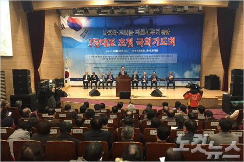 한국기독교총연합회(대표회장 이영훈 목사) 산하 대한민국나라살리기운동본부가 29일 서울 여의도에 있는 국회의원 회관에서 주최한 '나라와 교회를 바로 세우기 위한 3당 대표 초청 국회기도회' 현장.