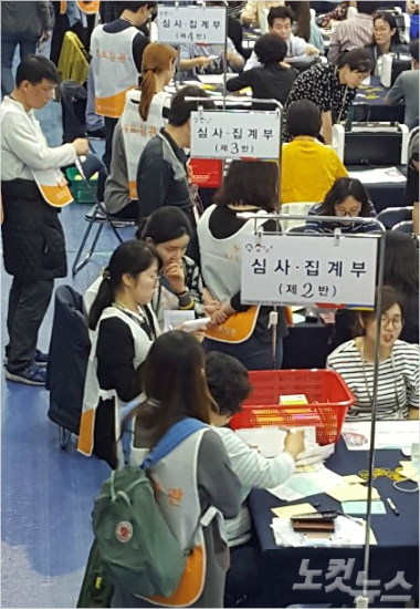 접힌 투표용지를 펴서 한데 모아 기계를 통해 1차 분류한 뒤, 다시 수작업으로 이를 재검하고 집계하는 방식으로 개표가 진행됐습니다.