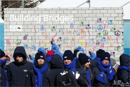 평창동계올림픽이 나흘 앞으로 다가온 5일 오전 강원도 평창올림픽 선수촌에서 열린 휴전벽 제막행사에서 참석자들이 휴전벽에 서명하고 있다. 이한형기자