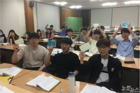 나사렛대 국제금융부동산학과 1학년 학생들이 수업도중 주택청약통장을 들어보이고 있다.