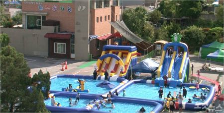 "이 무더운 여름 날씨에 원주제일교회에서 워터파크를 개최했습니다.