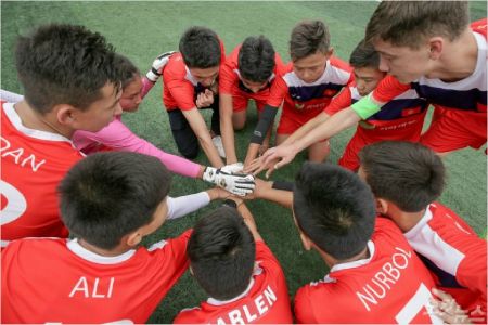 경기 전 키르기스스탄 선수들이 승리를 다짐하고 있다.(사진제공=기아대책)