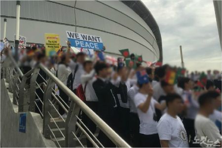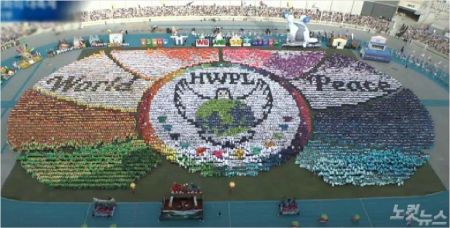짙은 화장을 한 수십 명의 초등학생들은 색동 한복과 각양각색의 티셔츠를 입고 경기장 안으로 이동했다. 가슴에 HWPL 로고가 쓰여진 옷을 입은 사람들은 행사 퍼레이드에 사용될 조형물들을 점검하고 있었다.