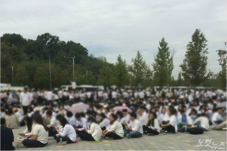 흰색 상의를 맞춰 입은 수많은 청년들이 입장을 기다리고 있다.