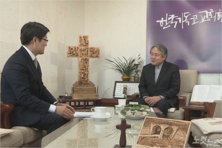한국기독교교회협의회(NCC) 이홍정 총무(우측)가 서울 종로구 대학로에 있는 한국기독교회관 내 NCC 총무실에서 인터뷰를 하고 있는 모습.