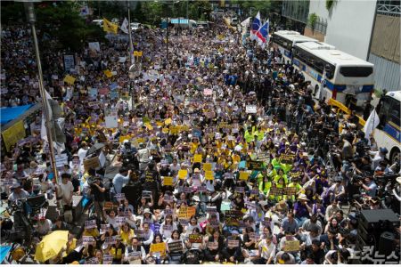 30도가 훌쩍 넘는 무더위에도 주최 측 추산 2만여 명의 수요시위 참가자들은 행사가 진행되는 2시간 내내 자리를 뜨지 않았습니다.