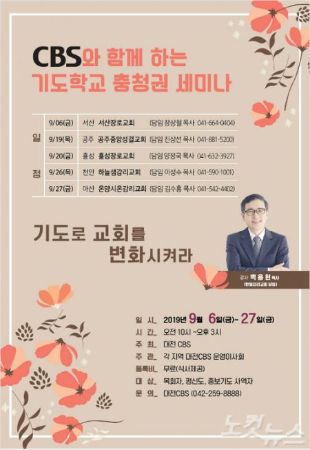 한편, 대전CBS의 기도학교 세미나는 서산에 이어 오는 19일에는 공주지역에서, 20일에는 홍성, 26일에는 천안 그리고 27일에는 아산에서 진행될 예정이다.