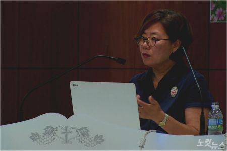 ▲ '2019 가을학기' 첫 강사로 나선 에스라성경통톡사역원 김미경 목사가 '사도행전과 서신서 개관'이라는 제목으로 강의를 진행하고 있다.