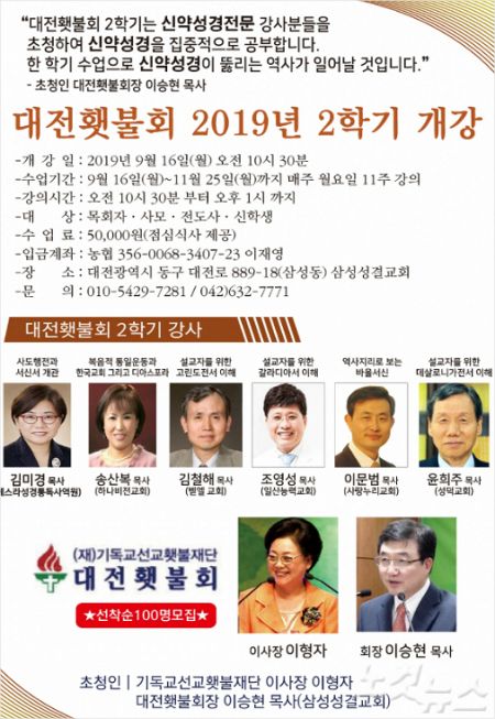 대전횃불회 가을학기는 이후 오는 30일에는 하나비전교회 송신복 목사가, 다음달에는 벧엘교회 김철해 목사, 일산능력교회 조영성 목사, 사랑누리교회 이문범 목사가 강의하며, 마지막 강의로 대구성덕교회 윤희주 원로목사가 나설 예정이다.