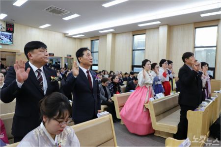 이와 함께 3부 임직추대식은 김정동 목사의 집례로 예식사와 임직자 소개, 서약, 장로 밎 안수집사, 권사 안수기도, 명예권사 추대, 선포 등으로 마련됐다.