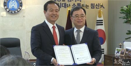 (좌)침신대 김선배 총장과 대기연 김철민 회장(우)이 MOU를 체결 후 기념촬영을 찍고 있다.