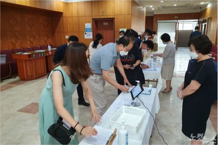 경기도 용인시 우리제일교회 관련 코로나19 누적 확진자가 16일 기준으로 100명이 훌쩍 넘어선 가운데 우리제일교회 인근 교회들은 보건당국의 방역지침에 맞춰 방역에 총력을 기울이고 있다.