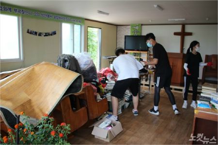 자원봉사자들이 비 피해를 입은 금산 성산교회를 찾아, 복구를 돕고 있다.