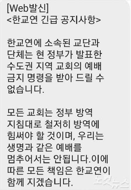한국교회연합 권태진 대표회장은 지난 19일, "방역당국의 지침을 받아드릴 수 없다", "모든 책임을 함께 지겠다", "예배를 멈춰선 안된다"는 내용의 긴급 공지를 전달했습니다.