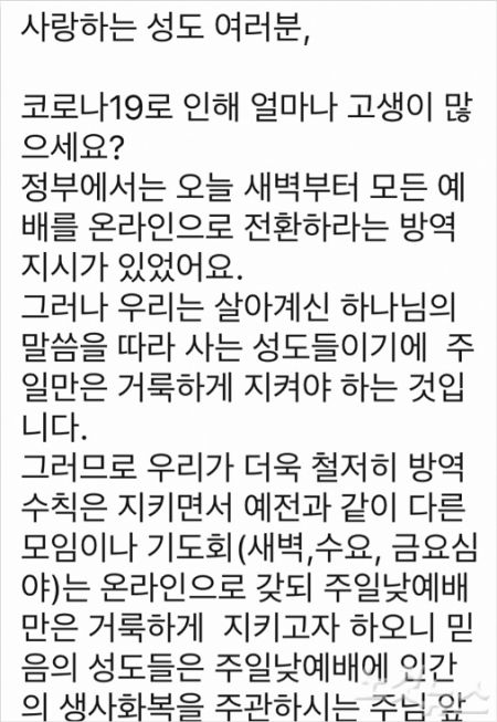 담임 김모 목사는 교인들에게 "생사화복을 주관하시는 주님 앞에 나아와 합심하여 기도하며 예배드리자"며 주일예배 참석을 강권했습니다.