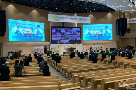 '주여! 이제 회복하게 하소서'를 주제로 열린 105회 정기총회는 코로나19로 비대면 화상회의 방식으로 진행됐습니다. 68개 노회 총대 1천500명은 전국 37개 교회로 분산해 화상으로 참여했습니다.