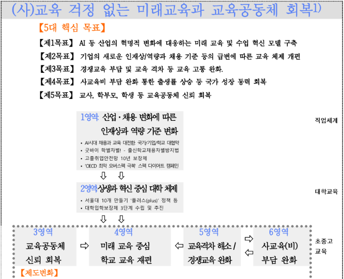 AI 시대 산업 변화에 대응하는 역량 중심 채용 제도 도입, 서열화된 대학 체제 개편과 미래형 학교교육 전환, 교육 격차 해소와 경쟁 완화, 사교육비 경감, 교육공동체 신뢰 회복 등의 내용이 담겼습니다.