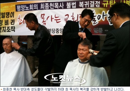 최 목사 복귀 반대측 ''삭발 반발''16일 분당중앙교회 앞. 최 목사 복귀를 반대하는 성도들의 삭발식이 진행됐다.