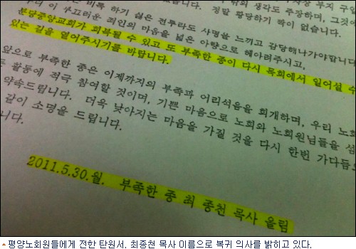 지난 5월 30일 서울 왕성교회에서 열린 평양노회 노회원들에게 돌린 탄원문에는 "분당중앙교회가 회복될 수 있고 또 부족한 종이 다시 목회에서 일어설 수 있는 길을 열어주시기를 바랍니다. 부족한 종 최종천 목사 올림"이라고 적혀있었다.